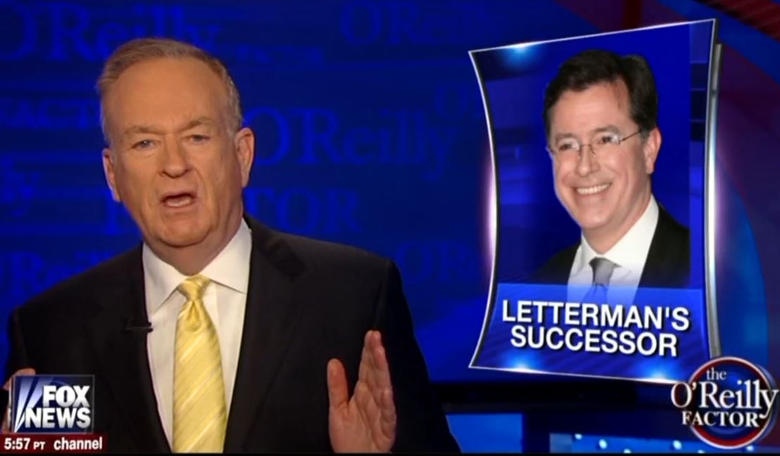 Days after labeling comedian Stephen Colbert a "darling of the far left" and "ideological fanatic," on Monday, Fox News host Bill O'Reilly again called out the David Letterman replacement: "Colbert has built an entire career on pleasing the left. And if you don't believe me, check out the reportage on his ascension, the far-left web sides and writers are thrilled." [Listen to the audio or watch the video after the jump]
