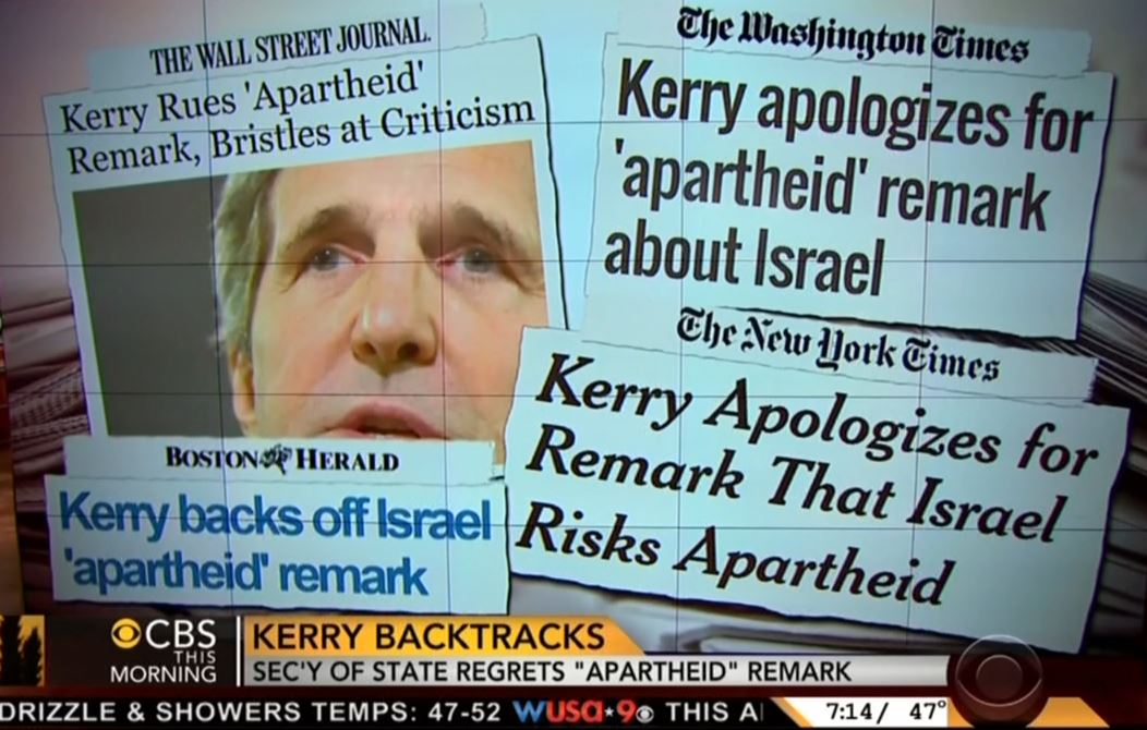 Kerry released a statement last night saying, quote, "If I could rewind the tape, I would have chosen a different word." Kerry says he's been a staunch supporter of Israel for years.