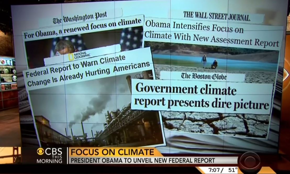 On NBC's Today, weatherman Al Roker stood in front of the White House holding up a draft copy of the report and proclaimed: "This is why we're here. This document, the National Climate Assessment Report, it comes out later this morning, and once it does, there are going to be administration officials, scientists around, we'll be talking with them. And then this afternoon we interview the President of the United States about this report."
