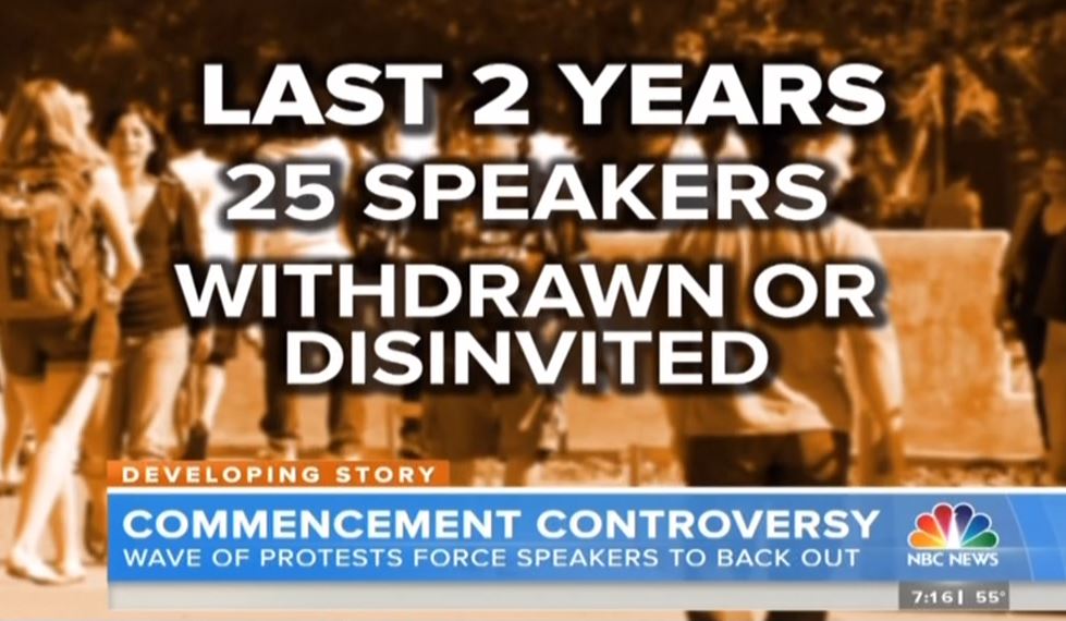 [ON-SCREEN HEADLINE: Commencement Controversy; Wave of Protests Force Speakers to Back Out]