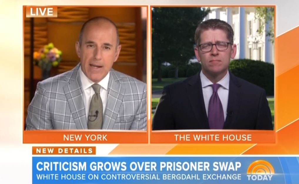 Carney argued: "...we believe that this is not a security threat to the United States and that there's sufficient mitigation to be comfortable with the transfer of those detainees to Qatar." Lauer pushed back: "Is this semantics here, Jay? Are we calling it a prisoner swap when, in fact, it is negotiating with terrorists?"