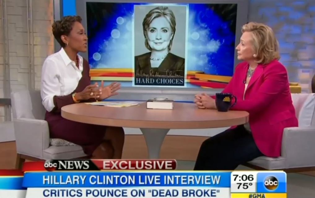In a live interview with Hillary Clinton on Tuesday's ABC Good Morning America, co-host Robin Roberts actually pressed the former first lady on claims that she and Bill Clinton left the White House "dead broke": "The reaction has been very strong about what you said to Diane [Sawyer]....using the words 'struggling' and that it wasn't easy, when many Americans are in the same situation but they know they don't have a book and the opportunities that you have. Any regrets in how you phrased that?" [Listen to the audio or watch the video after the jump]