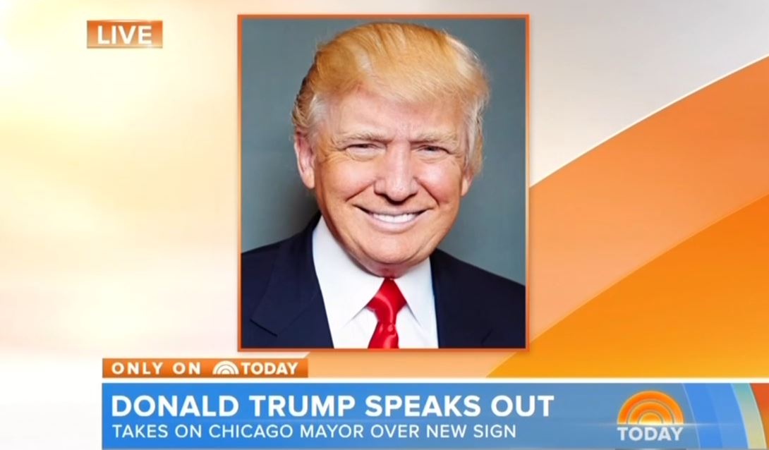 At the top of Today, co-host Matt Lauer proclaimed: "Tasteful or tacky? The bitter feud between Donald Trump and the mayor of Chicago over this giant sign." During the later report, the headline on screen hyped: "Trump vs. The Mayor of Chicago; Clash Over Trump's Giant New Sign."