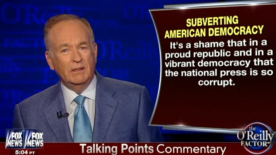 At the top of his Wednesday show, Fox News host Bill O'Reilly denounced the liberal media for "subverting American democracy." He cited a particularly glaring double standard: "You may remember New Jersey Governor Chris Christie being pounded by the national media for a controversy on the George Washington Bridge....devoting 112 minutes to the situation in the first week....But when the VA scandal story broke, there was no coverage on the nightly network news broadcast for almost two weeks." [Listen to the audio or watch the video after the jump]