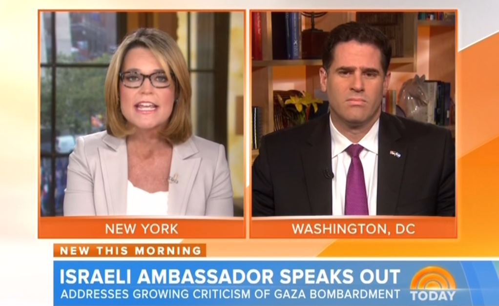 On Thursday's Today, Guthrie began her interrogation of Dermer by demanding: "Again and again Israel has said it doesn't target civilians, that in fact it goes above and beyond to minimize civilian casualties. And yet, we continue to see civilians die....How would you grade Israeli forces in terms of its stated mission of minimizing civilian casualties?"