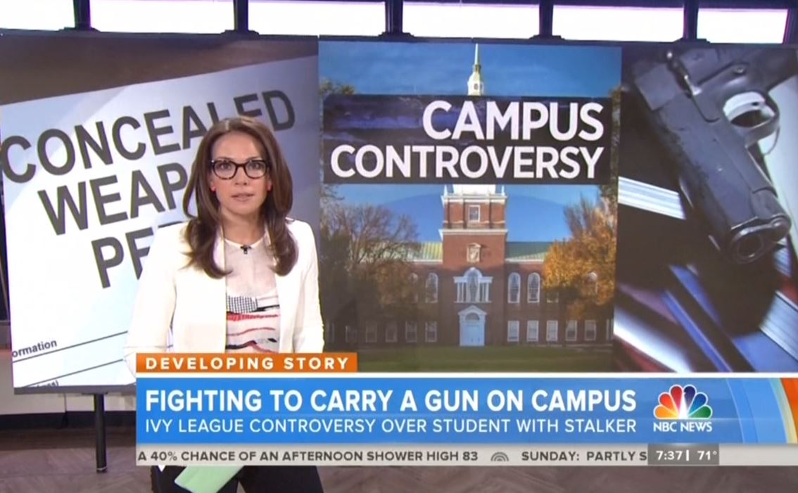 SAVANNAH GUTHRIE: I think this next story's going to get some conversations going. Now to an item on one ivy leaguer's back to school list that is making national headlines. A 20-year-old Dartmouth student wants to carry a gun on campus for her own protection against a known stalker. The university has said no and this is a decision that could force the young woman, she says, to drop out of school. Today's Erica Hill has more on this story. Erica, good morning.