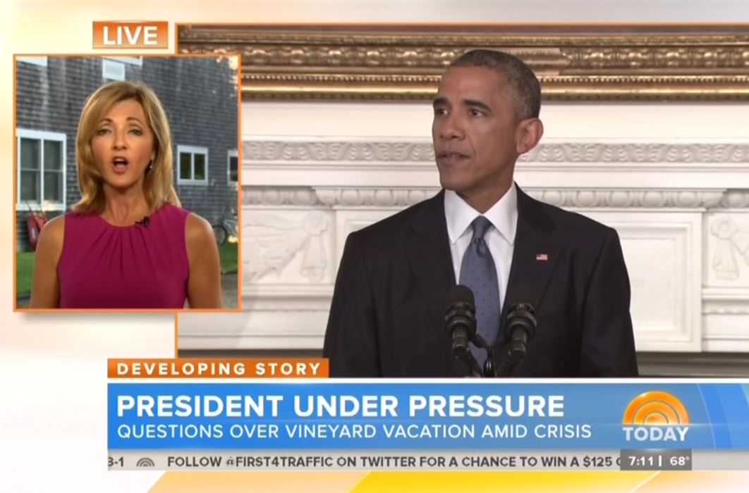 Eager to defend President Obama from criticism of his vacation in Martha's Vineyard amid multiple international crises, both Sunday's ABC Good Morning America and Monday's NBC Today used false spin to downplay the bad optics. [Listen to the audio or watch the video after the jump]