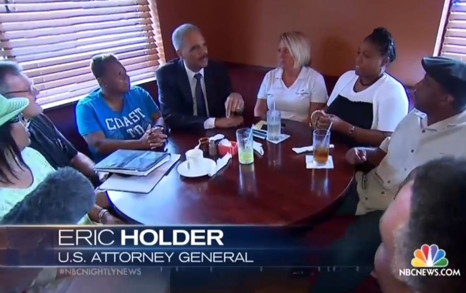 Between Wednesday's evening newscasts and Thursday's morning shows, NBC, CBS, and ABC all praised Attorney General Eric Holder's visit to Ferguson, Missouri. On Wednesday's NBC Nightly News, correspondent Ron Allen proclaimed: "Those demanding justice for Michael Brown are relieved that Eric Holder is here because they simply don't trust the local authorities." [Listen to the audio or watch the video after the jump]