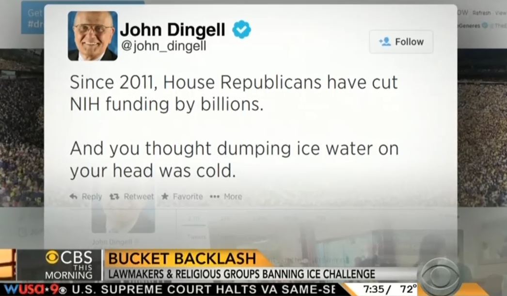 And then there's politics. Representative John Dingell, a Democrat from Michigan, accuses some Republicans of de-funding ALS research while taking the ice bucket challenge. He tweeted, "Since 2011, House Republicans have cut National Institutes of Health funding by billions. And you thought dumping ice water on your head was cold."