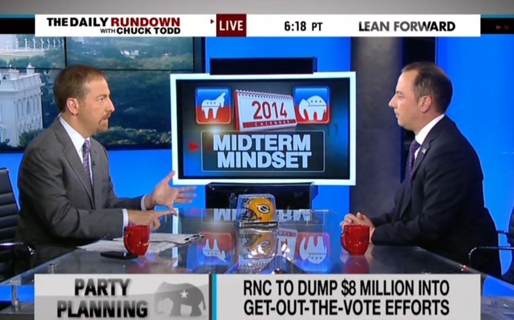 Near the end of the exchange Todd hit the GOP over campaign spending: "Do you wish your candidates weren't all showing up in one place, like with the Koch brothers, at one of these events? Do you think that sort of feeds the Democrats an issue about saying they're being bought and paid for?"