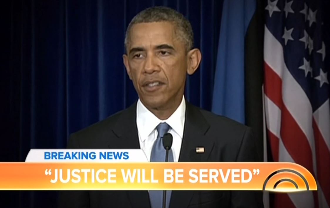 [ON-SCREEN HEADLINE: "We Will Not Be Intimidated"; President Says "Justice Will Be Served" to ISIS]