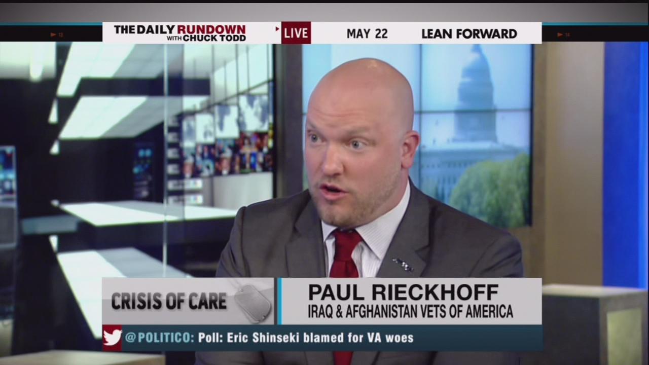 On the May 22 edition of The Daily Rundown with Chuck Todd, the MSNBC anchor invited Paul Rieckhoff, founder and CEO of the Iraq and Afghanistan Veterans of America, to discuss his organization’s reaction to the Obama’s administrations handling of the VA scandal.