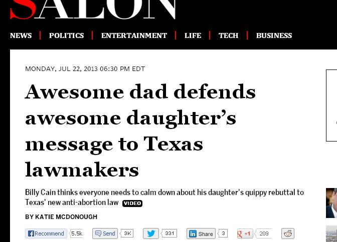 her “awesome” father Billy Cain for his “touching” “defense of his daughter’s activism,” Salon further whined that “reproductive rights opponents (and jerks on social media) wasted no time in losing their damn minds over it.”