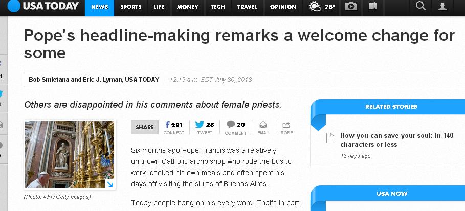 Surprise, surprise: the media still can’t seem to get their act together on the Pope’s words. Continuing the sloppy reporting on the Pope’s recent press conference, USA Today’s print version flubbed the Pope’s remarks on women’s ordination.