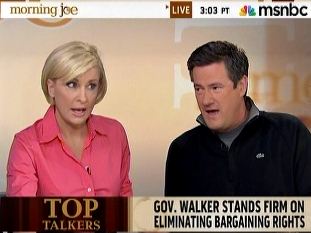 At the top of Morning Joe, Joe Scarborough referenced the hateful emails he and Mika had received from the left and the similarly ugly signs held by Wisconsin union protesters. Mika reflexively defended the vileness, saying that people were "hurting and really don't feel like they're being heard."