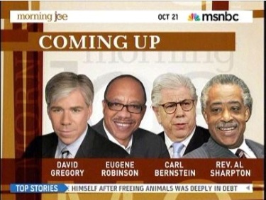 Sometimes, a show's guest list is enough to illuminate its liberal bias. Take today's Morning Joe. Joe Scarborough has previously spoken of the show's prevailing 10:1 ratio of liberal to conservative guests. But Morning Joe took matters that silly millimeter longer today, with a lineup utterly devoid of any Republican or conservative guests, to wit:
