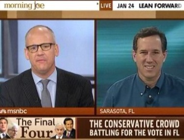 Rick Santorum to John Heilemann [and by extension to MSM at large] on today's Morning Joe: "it's your responsibility to defend the president, not mine." Ouch! If Newt's deft dicing of John King and Juan Williams paid huge electoral dividends, Santorum might anticipate a much-needed bump after running roughshod over the New York mag reporter.