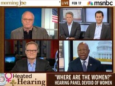 Note: it wasn't just this Morning Joe segment which was devoid of women. Not one woman panelist or guest appeared till the show's last half hour, and even then it was in a pre-taped segment. We could generally care less, but the hypocrisy was simply off the charts. Barnicle couldn't ignore the irony, alluding to the segment's all-male composition. Note also that at yesterday's House hearing, two women did testify in a second panel.