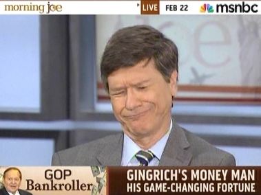 MIKA BRZEZINSKI: [Sighs]. Ughh. This is Sheldon Adelson: "I'm against very very wealthy people attempting to or influencing elections . . . but as long as it's doable I'm going to do it. Because I know that guys like Soros have been doing it for years, if not decades. And they stay below the radar by creating a network of corporations to funnel their money. I have my own philosophy and I'm not ashamed of it. I gave the money because there is no other legal way to do it. I don't want to go through ten different corporations to hide my name. I'm proud of what I do and I'm not looking to escape recognition."