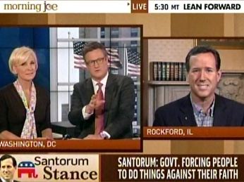 A rather testy exchange on today's Morning Joe, with co-hosts Joe Scarborough and Mika Brzezinski going at it with Rick Santorum. A full five minutes of Santorum's segment were devoted to questioning him on his views on contraception and religious freedom.