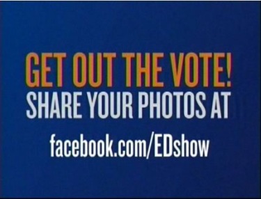OFF-SCREEN ANNOUNCER [as GET OUT THE VOTE graphic appears on screen]: Share your Get Out The Vote photos as facebook.com/EDshow. A special edition of the Ed Show, live from Wisconsin, Tuesday at 8 and 11 Eastern, on MSNBC.