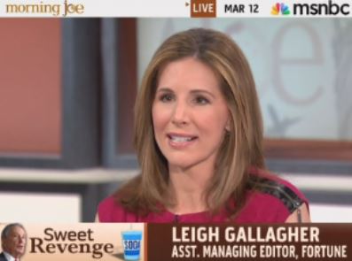 You'd think someone who works for "Fortune" magazine would have more have more respect for free people and free markets. But on Morning Joe, today, there was "Fortune" editor Leigh Gallagher boosting Michael Bloomberg's nanny state. Gallagher approvingly quoted Mayor Mike to the effect "sometimes you have to do not what people want you to do. You have to take people by the hand and lead them."