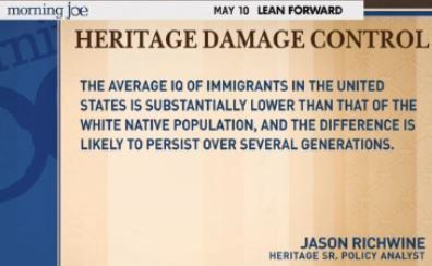 JOE SCARBOROUGH: Al, let me read this for you, Jason Richwine, a senior analyst for Heritage, who co-authored this immigration study, wrote this in his Harvard dissertation. Quote, "the average IQ Of immigrants in the United States is substantially lower than that of the white native population, and the difference is likely to persist over several generations." Al, it's --