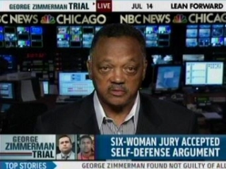 JESSE JACKSON: Frankly, I am stunned over this race [?], this tremendous miscarriage of justice. When the jury says not guilty: he's at least guilty of murder. An armed man, racially pursuing and profiling a young African-American boy, and kills him. And in this case, the prosecutor denied, should I say ignored the matter of race, and the defense denied this. But the fact of the matter is this is a pattern of behavior toward young African-American men, whether it is Grant in Oakland, or Diallo in New York or Trayvon Martin in Florida, and it's very painful.