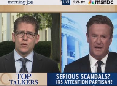 When on today's Morning Joe, Obama spokesman Jay Carney had the chutzpah to call the IRS mess a "phony scandal,"Joe Scarborough ripped into him, calling Carney out for using "talking points," instructing him to "answer my question" and informing Carney that "I'm not somebody you talk down to from your podium." Ouch! H/t NB reader cobokat.