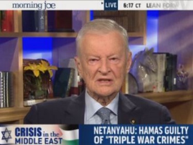 Instead, Jimmy Carter's national security adviser had harsh words for only one person: Benjamin Netanyahu. Appearing on today's Morning Joe, Brzezinski said he didn't include Netanyahu in the category of leaders man enough to negotiate, accusing the Israeli PM of having "scuttled" peace efforts--again without a word of criticism for Hamas. Zbigniew ended his anti-Israel tirade by decrying that "the ideologues, hard-liners, the ones that promulgate confrontation are in charge, and that's what's so hard and so disgustingly destructive." Any disgustingly destructive hard-liners in Gaza, Zbig? View the video after the jump.