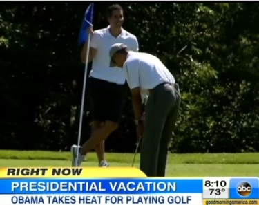 Harris' ignorance—or intentional disregard of the facts—was displayed during a segment today's GMA after Jonathan Karl reported that President Obama hit the links within an hour of landing at Martha's Vineyard and just hours after making a statement about US attacks on ISIS forces. After Karl said that Woodrow Wilson, in office during WWI, had played more golf than any other president, Harris claimed "George W. Bush played his fair share of golf during the Iraq war as well." In fact, as noted above, W renounced golf in August, 2003, saying "I don't want some mom whose son may have recently died to see the commander in chief playing golf . . . I feel I owe it to the families to be as -- to be in solidarity as best as I can with them. And I think playing golf during a war just sends the wrong signal." But defending Obama was apparently more important for Harris than the facts. View the video after the jump.
