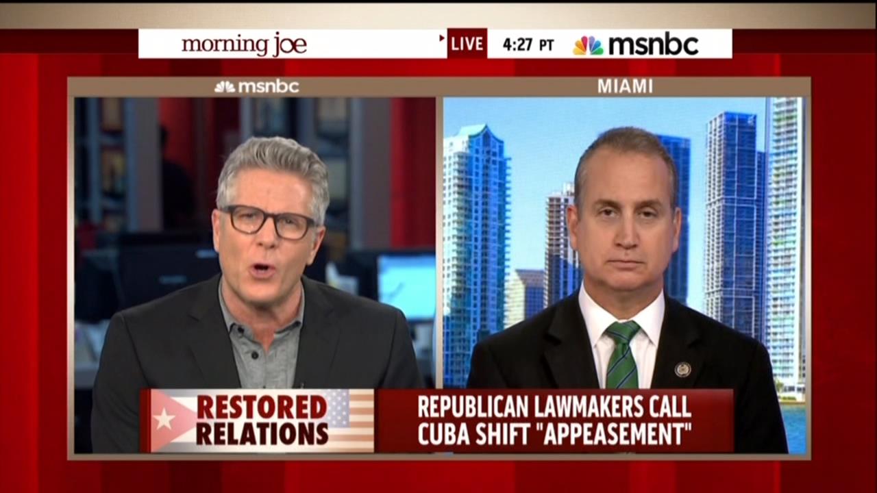DONNY DEUTSCH: Congressman, to sit and just look at the last 50 years and continue as is has been nothing but a failure versus taking a step to open the door to the future, to liberating 11 million Cubans, to bringing them into the 21st century. How do you argue with that with the argument that we are giving in to terrorists? It is such a flawed argument. This is not ISIS. This is a country 90 miles away. This has been long coming. And aren't you just giving us the typical Republican "I have to say this" versus --JOE SCARBOROUGH: Mario, Democrats also disagree with this too, right?