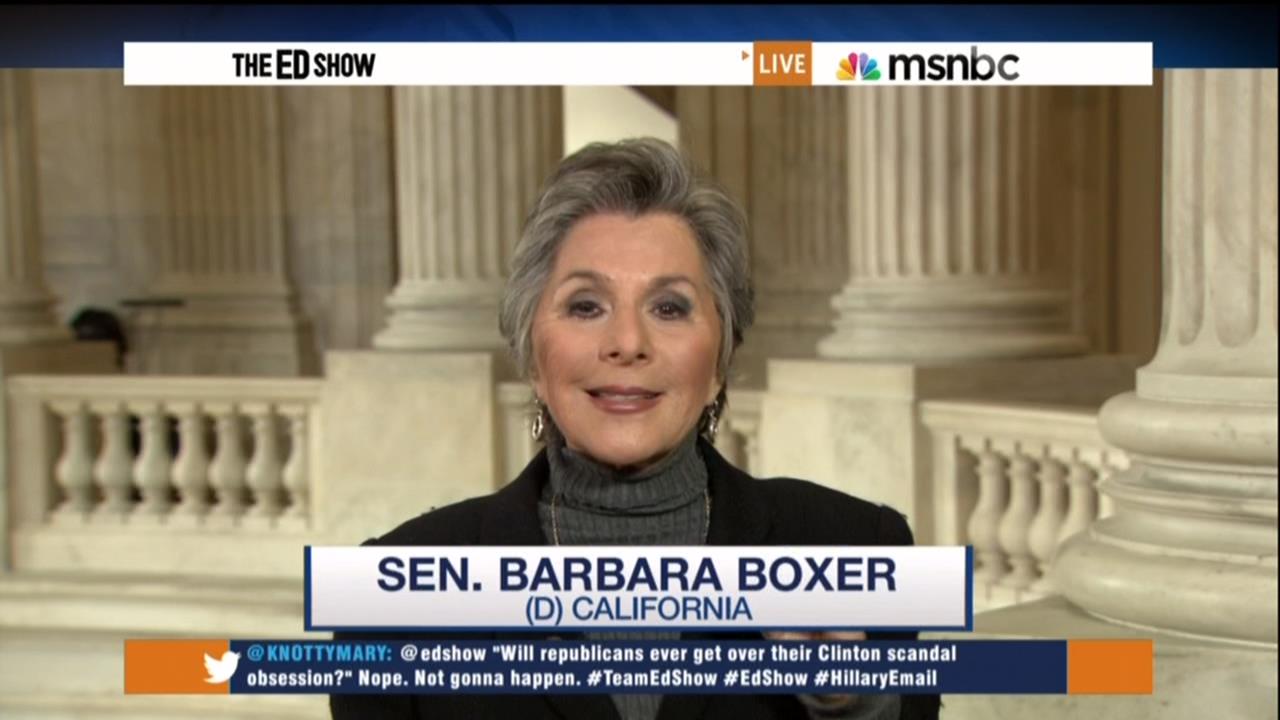 Note: Looks like Boxer is out there making the MSNBC rounds on Hillary's behalf. Newsbuster Kyle Drennen caught her on Andrea Mitchell's show saying it was time to "move on" from the email matter. Boxer's a logical Hillary front woman, since she's not seeking re-election so doesn't have to worry about taking the political hit for defending the indefensible. Speaking with Schultz, Boxer really gave her game away when she said: "we've just got to get past this, because you could talk all day." Precisely!