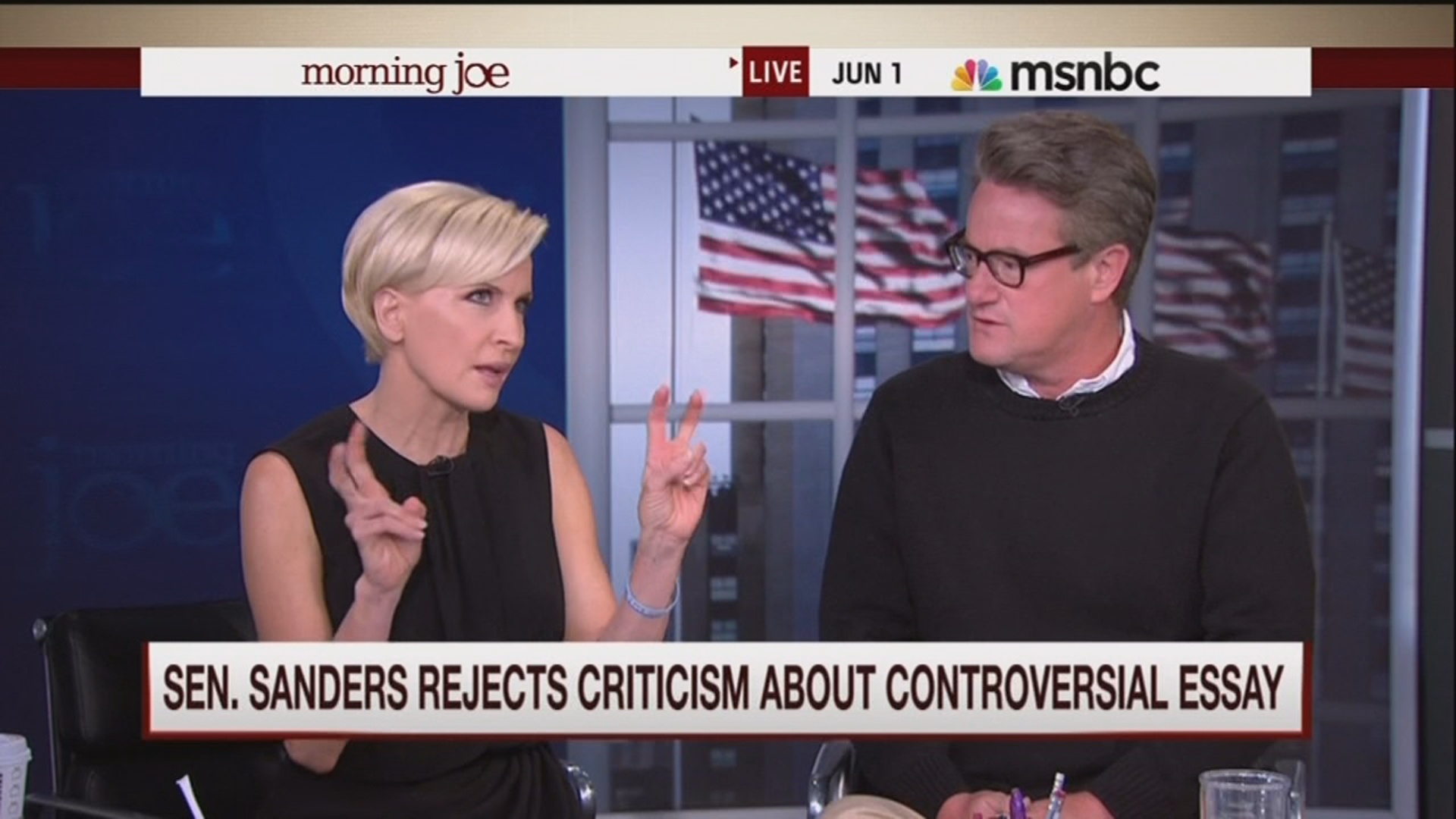 Note also that Mika warned Willie Geist against dismissing the Sanders remarks, telling him he'd be "killed online." That was presumably a reference to items such as this one last week by this NewsBuster. The difference is that then, Mika tried to stifle discussion of Sanders' remarks, whereas Willie was simply saying that the same standard should be applied to Republicans and Democrats.