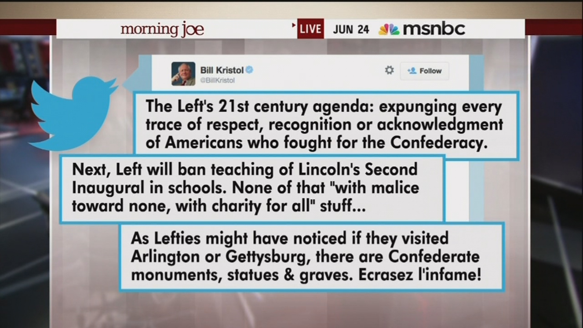 MIKA BRZEZINSKI: Bill went on Twitter to talk about the flag controversy--oh good God. "The left's 21st century agenda: Expunging every trace of respect, recognition or acknowledgement of Americans who fought for the Confederacy. Next the left will ban teaching of Lincoln's second inaugural in schools. None of that "with malice toward none, with charity for all" stuff. If lefties might have noticed if they visited Arlington or Gettysburg, there are Confederate monuments, statues and graves. Ecrasez l'infame!