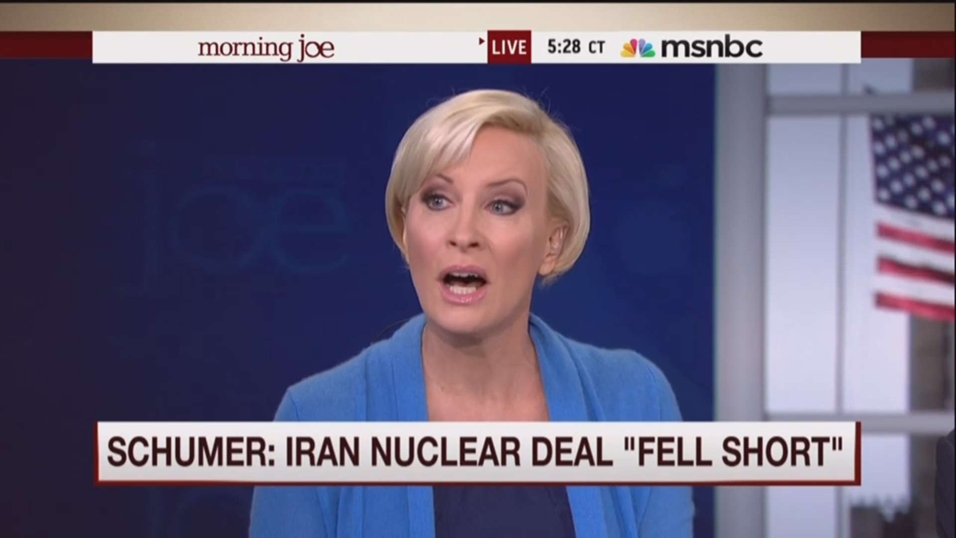 Well, she did stop short of accusing Chuck Schumer of being worried about losing donations from co-religionist contributors . . . But on today's Morning Joe, Mika Brzezinksi repeatedly claimed that Schumer was acting out of politics in opposing the Iran deal.