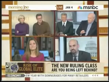 Increasing indifference of American millionaires and billionaires toward their own country was another subject of the story. Those successful in a global economy are "a little less concerned" with the American middle class and domestic issues, noted James Bennet. "Is that an understatement, 'a little less concerned'?" an impassioned Joe Scarborough scoffed.