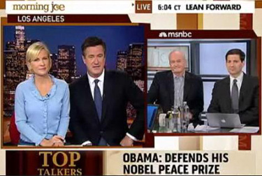 SCARBOROUGH: Well you know Mark Halperin has to write many chapters about Barack Obama in the upcoming "Game Change 2," so let's go to him now for a defense of the President receiving the Nobel Prize. I'm joking. But seriously, he had to speak about it yesterday. It is ironic, since he received the award, he's tripled the number of troops in Afghanistan, he has, I guess about 120-130 cruise missiles on Libya getting in them middle of a civil war in Africa – this is not an anti-war peacenik in the White House.