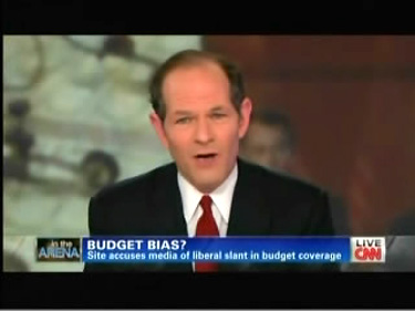 However, on the April 18 edition of "In the Arena," Spitzer hosted the MRC's Brent Bozell and offered a testy defense of his reporting on the budget battle, claiming no bias.