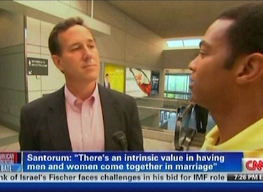 As NewsBusters reported Friday, Lemon badgered Santorum in an airport over his positions on gay marriage. The CNN segment featured an abbreviated portion of the interview, and Lemon aired the extended version Sunday evening on the 7 p.m. EDT hour of Newsroom.