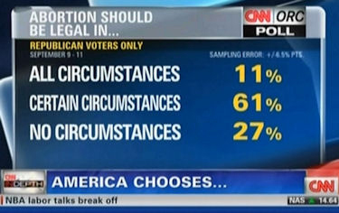 Of the 61 percent of Republicans who supported legalization of abortion in "certain" cases, 53 percent said it should be legal only "in a few" cases, while just 8 percent supported its legalization "in most circumstances."