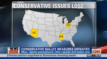The network relentlessly touted the defeat of Mississippi’s “Personhood” initiative – which would define life as beginning at conception – as they reported it 14 times in 9 hours. CNN also highlighted the failure of a measure pushed by Ohio’s Republican Governor John Kasich that limited the rights of unions to collectively bargain, as that story appeared 11 times in 9 hours of coverage.