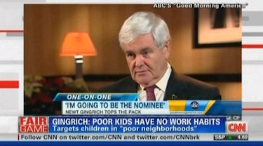 [HEADLINE: "Gingrich: Poor Kids Have No Work Habits: Targets children in 'poor neighborhoods'"]