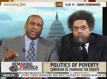 And although both Smiley and West feel they need to "keep the pressure" on Obama and the Democrats, West surmised that "Barack Obama is much better than the mediocrity among the Republicans." Neither guest received any scrutiny from the center or the right when they appeared on CNN and MSNBC; the only mildly critical questions came from the left.