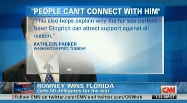 And the conservative writer, Kathleen Parker, wrote about, you know, it's that Romney can't connect with the people as has been – "It isn't that Romney can't connect with the people as has been pronounced repeatedly. It's that the people cannot connect with him. This also explains why the far less perfect Newt Gingrich can attract support against all reason." How do you fix that?