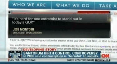 In the video clips which aired in the report, Santorum strongly stated that he would not mix his opposition to contraception with his policies as president, meaning that he would not ban contraceptives. Nonetheless, Snow quoted the pro-abortion and pro-Democrat group Emily's List, as well as phoney-conservative columnist Jennifer Rubin, as slamming him as out-of-touch.