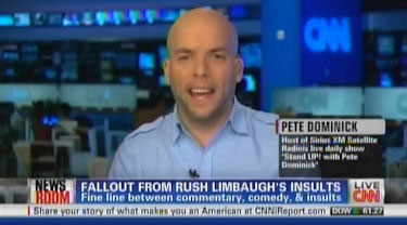 Liberal comedian Pete Dominick, a CNN contributor, listed the "differences" he saw between Rush Limbaugh's crack at Sandra Fluke and Bill Maher ripping Sarah Palin in vile fashion, on CNN Wednesday. "[T]here still is a difference in terms of what comedians say," he said of Maher versus "arguably" the "most influential commentator in all of politics" Rush Limbaugh.