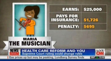 "So the individual mandate is going to help pay for people like Maria, the musician," noted correspondent Elizabeth Cohen. "Maria only earns $25,000. She will only have to pay $1,726 for insurance and then the government is going to give a big subsidy. That's why that cost is so low. The reason why the government can give the subsidy is because of that individual mandate that you mentioned."