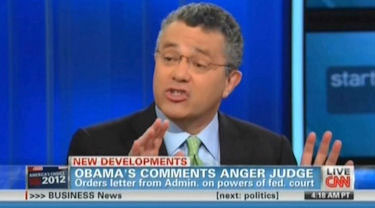 CNN's senior legal analyst said on Thursday's Starting Point that "some of these Republican judges are just deranged by hatred of the President." Jeffrey Toobin was railing against the three-judge panel on the U.S. Fifth Circuit Court that had made the Justice Department write a three page memo about the Obama administration's take on judicial review.
