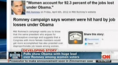 On Wednesday's The Situation Room, CNN used a slanted PolitiFact report to dismiss Mitt Romney's claim that "women account for 92.3 percent of the jobs lost under President Obama." CNN correspondent Jim Acosta aired a clip of Romney making the claim before adding that "the watchdog website PolitiFact rates that claim as 'Mostly False'."